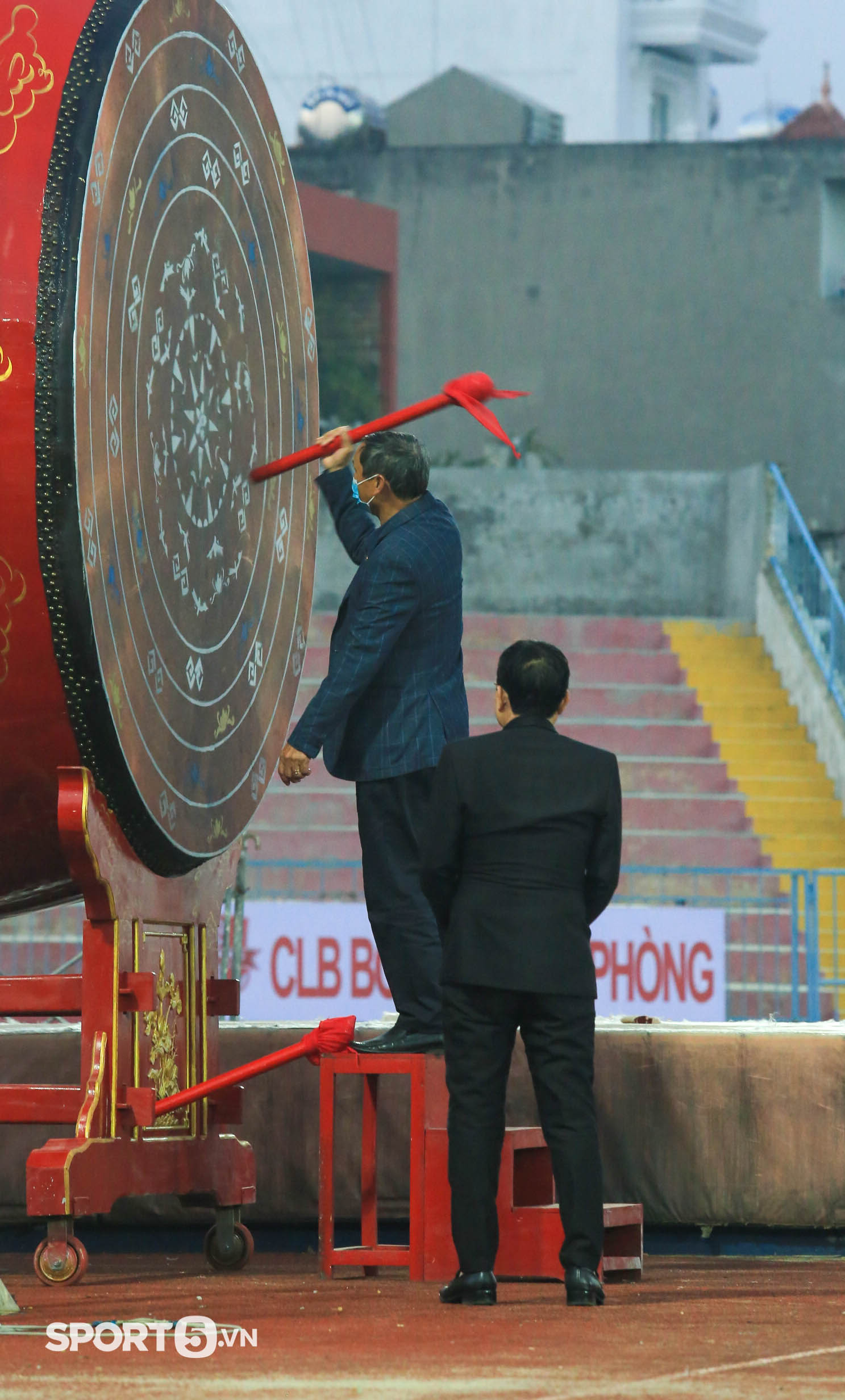Trước khi trận đấu diễn ra, HLV Mai Đức Chung được BTC mời xuống sân đánh trống chào mừng nhân dịp trận đấu sân nhà đầu tiên của Hải Phòng