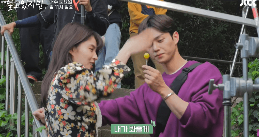 Cô nàng đầy tinh tế khi lấy tay đuổi bọ khỏi bám vào cây kẹo mà Song Kang đang cầm.