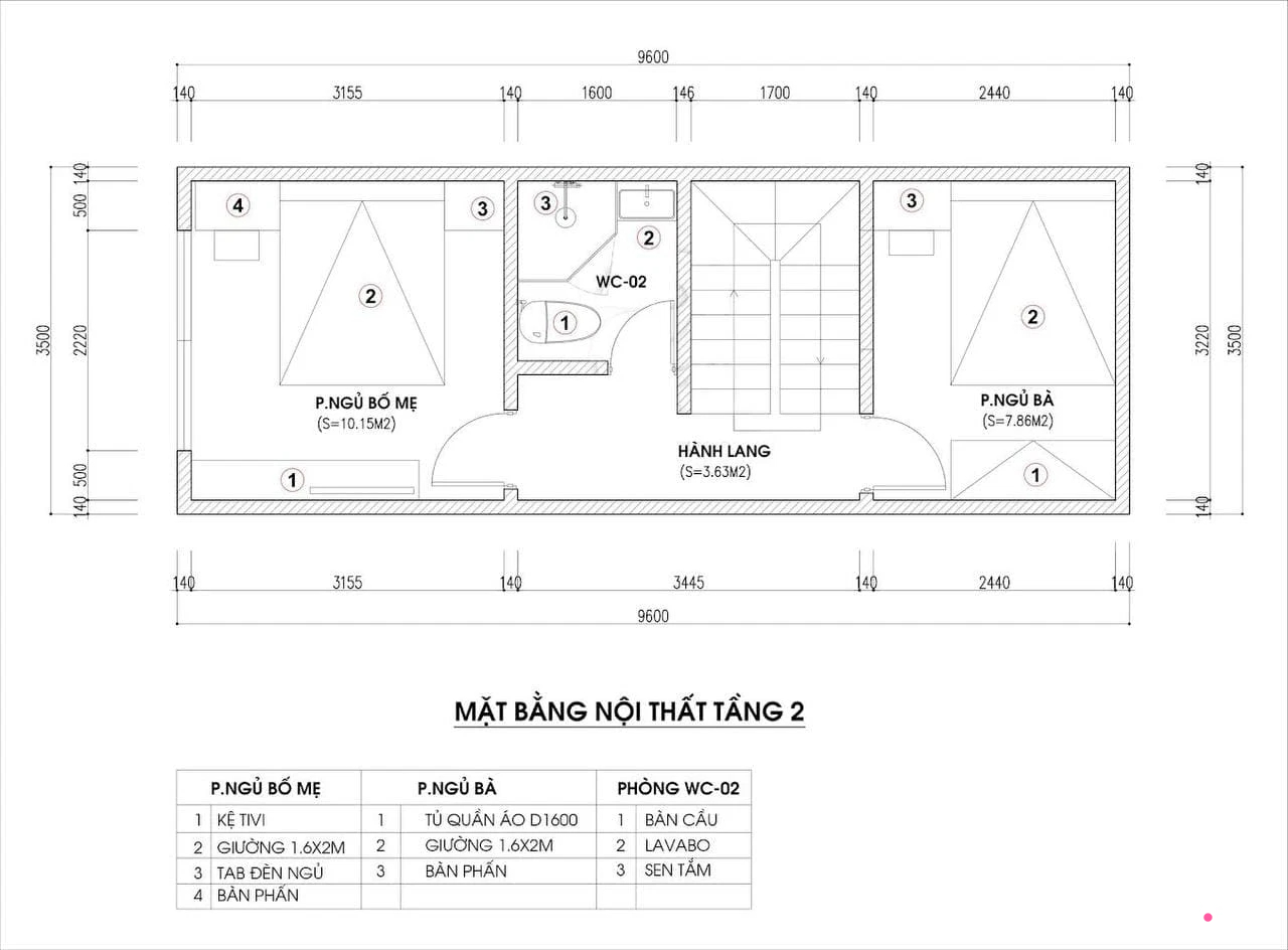 Mặt bằng tầng 2: Chúng tôi thiết kế 2 phòng ngủ cho bà và bố mẹ ở giữa phòng vệ sinh và tắm chung. Dù với diện tích hạn chế nhưng các phòng đều được thiết kế đủ các đồ dùng cơ bản.