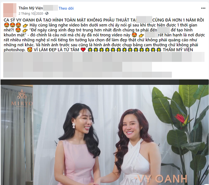 Mới đây, cộng đồng mạng đã "đào mộ" lại đoạn clip của ca sĩ Vy Oanh đang chia sẻ về phương pháp tạo hình toàn bộ gương mặt mà không phẫu thuật. Vy Oanh thực hiện phương pháp thẩm mỹ này để hoàn thiện nhan sắc vào khoảng đầu năm 2020 tại một thẩm mỹ viện ở Hà Nội.